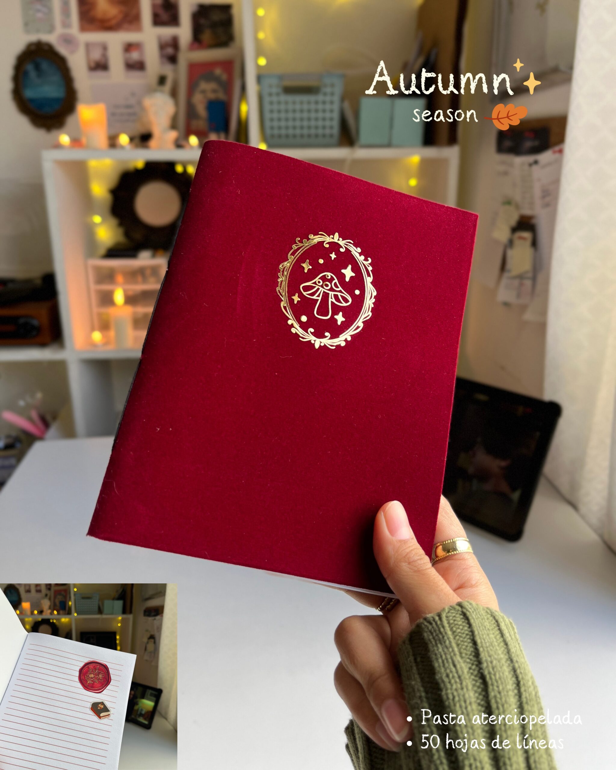 - Libreta con pasta de terciopelo y detalles dorados en papel de líneas.